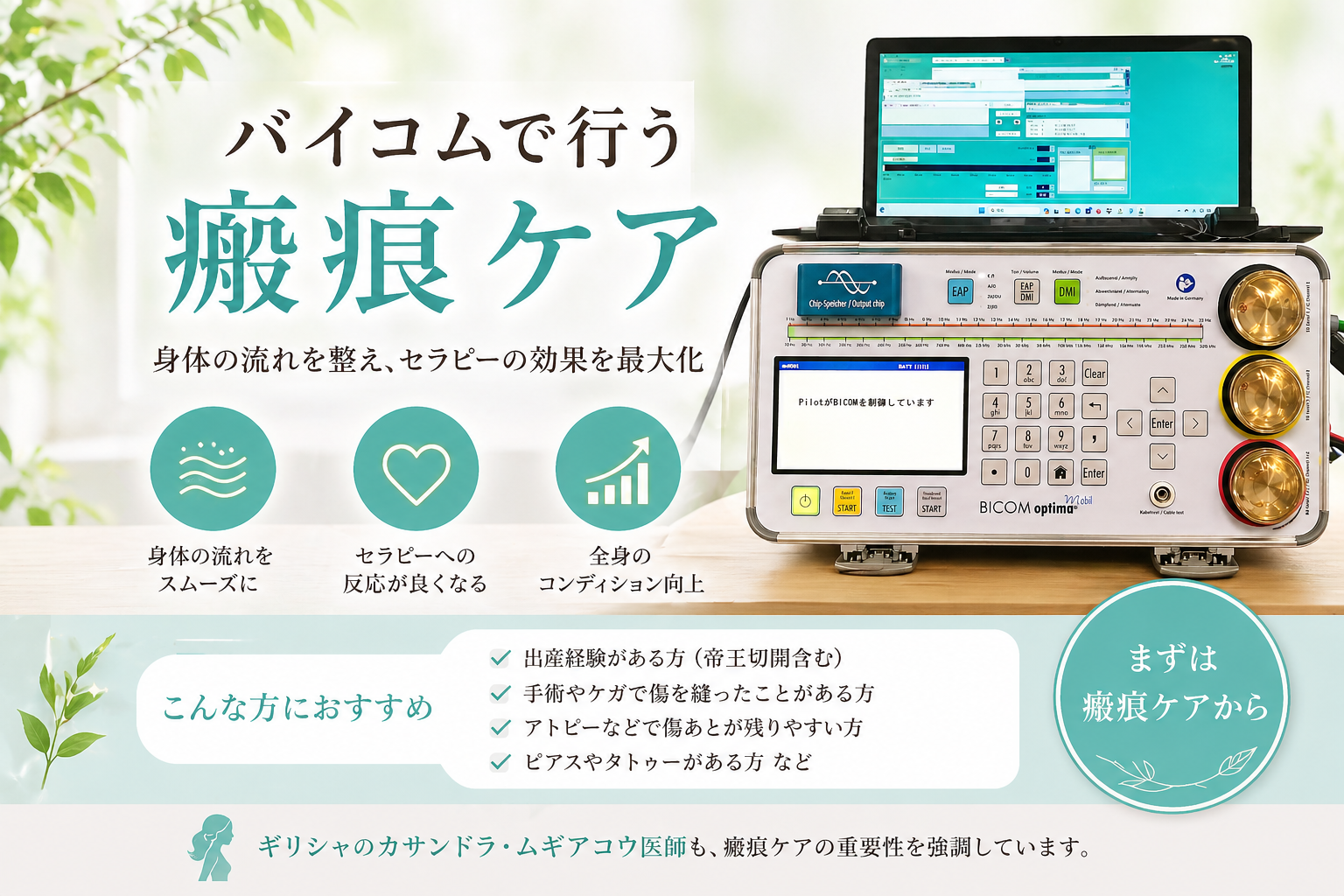 2025年9月7日に大阪で開催されたバイコムの研究会において、来日したギリシャの医師であるカサンドラ・ムギアコウ先生も、この瘢痕ケアの重要性を強調していました。